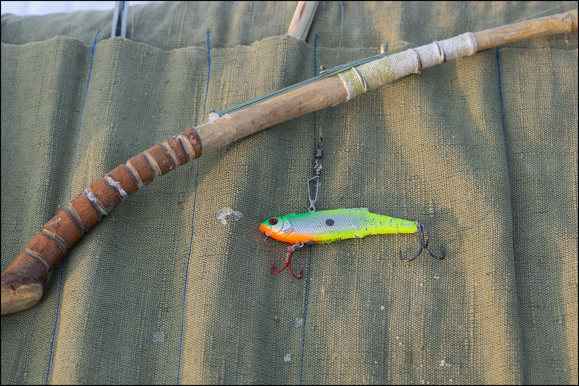 С первых минут рыбалки Валера поймал пару щук, у меня же была тишина. Но вскоре я получил такую сумашедшую поклевку, которую желаю почувствовать всем. В один миг после поклевки - рыба начала активно сматывать флюр с катушки, при том что фрикцион затянут был полностью и руками практически невозможно было стравить флюр. Подбежал Валера и мы пытались уже вдвоём остановить рыбу. Мы несколько минут боролись с рыбой, рыба вымотала почти весь флюр со шпули, но мы её остановили. Кое как подвели рыбу к лунке, но завести её даже в большую лунку не смогли, флюр спустя нескольких минут борьбы с рыбой лопнул, да и размер рыбы по всей видимости был внушителен, рыба "отказалась" лесть в лунку. Глубина в том месте была порядка 3-3.5м, плюс не слабое течение, которое явно было против нас в тот момент. Поклевка произошла на "джиг" - морская джигголовка от Fujiwara и твистер.